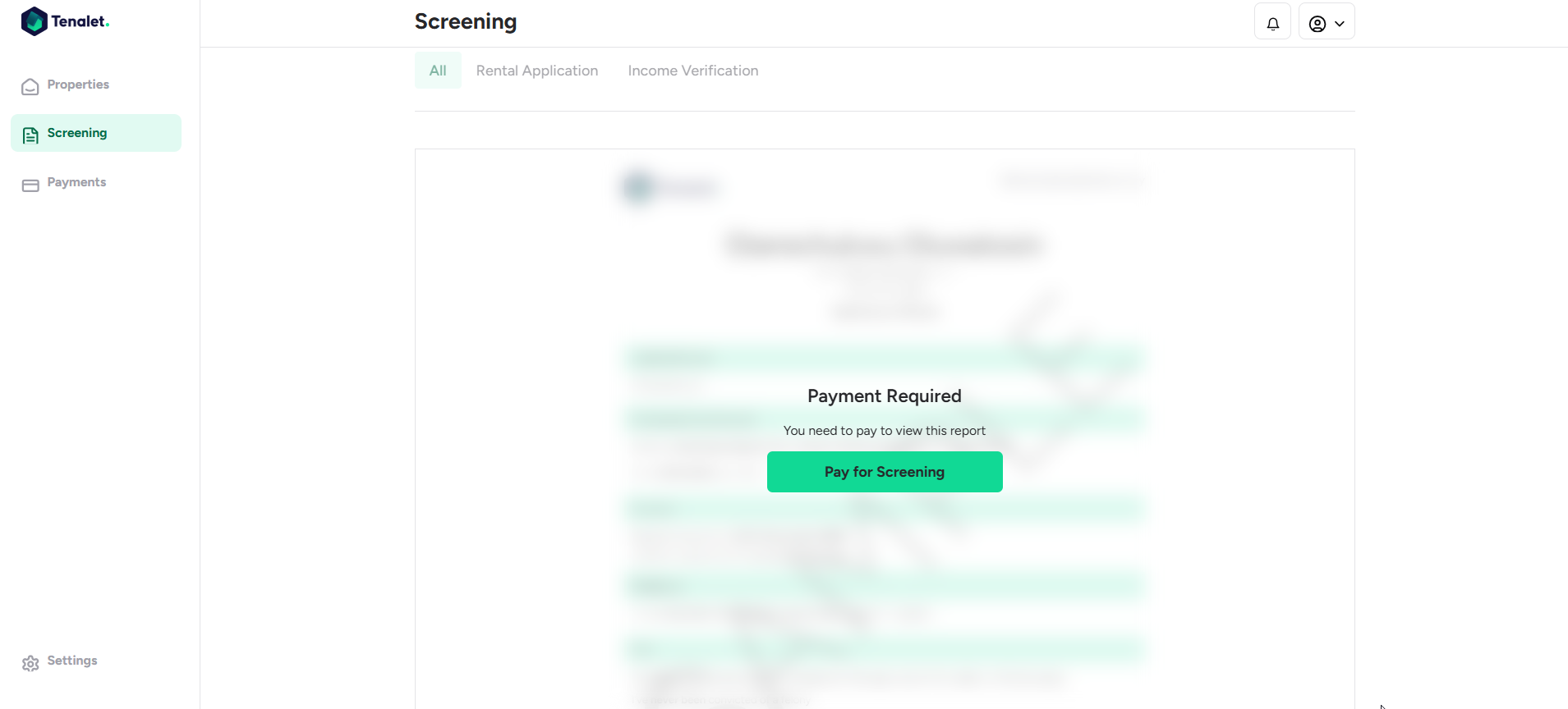 5. In the pop-up, click Pay for Screening. After payment processes, you can access the full applicant report, including their credit report, income verification, and personal information.