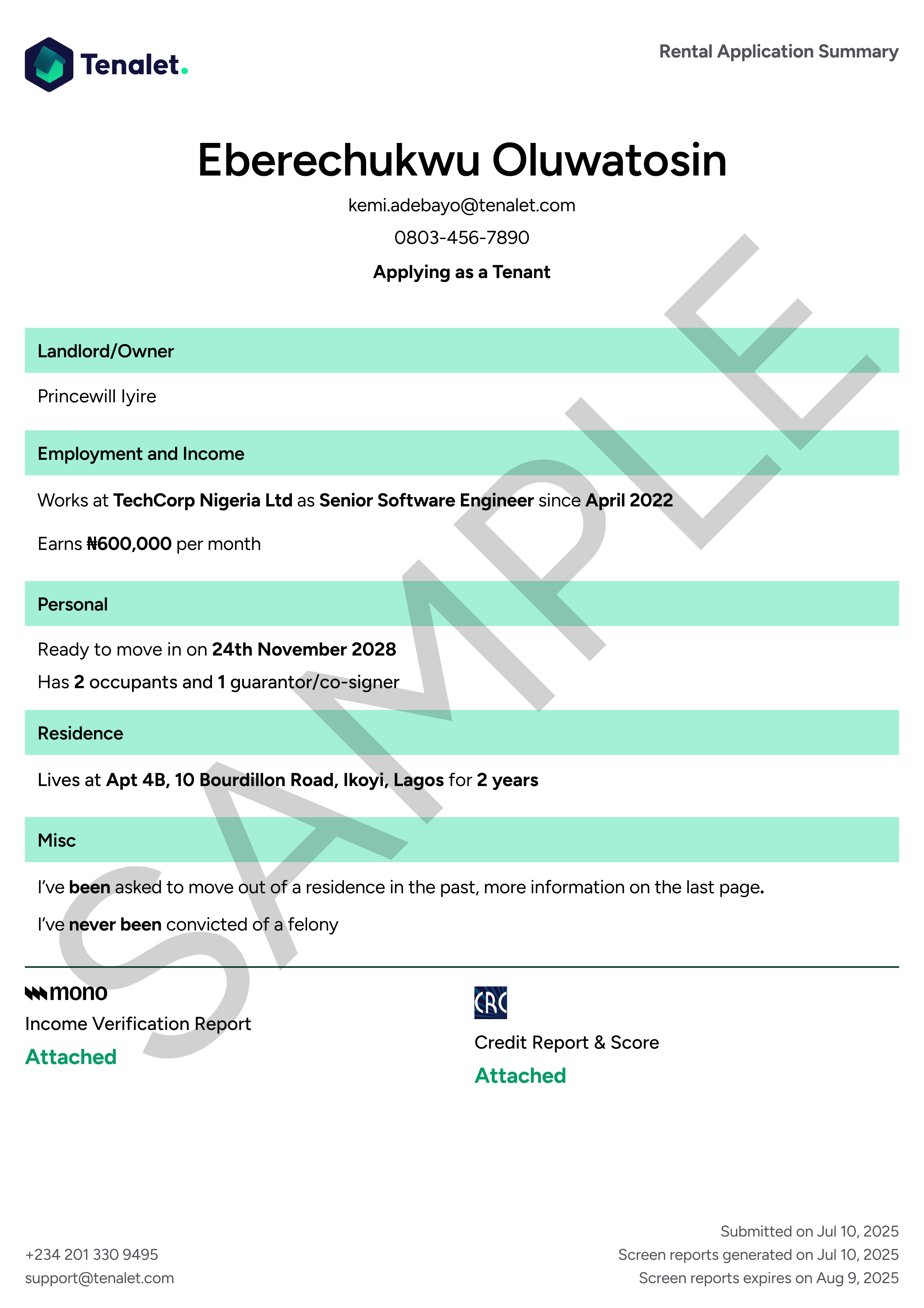 The Tenalet screening report provides all the information you need to make an informed decision about an applicant. It is generated the same day the application is submitted. When an applicant completes screening, you receive a PDF report with these sections: