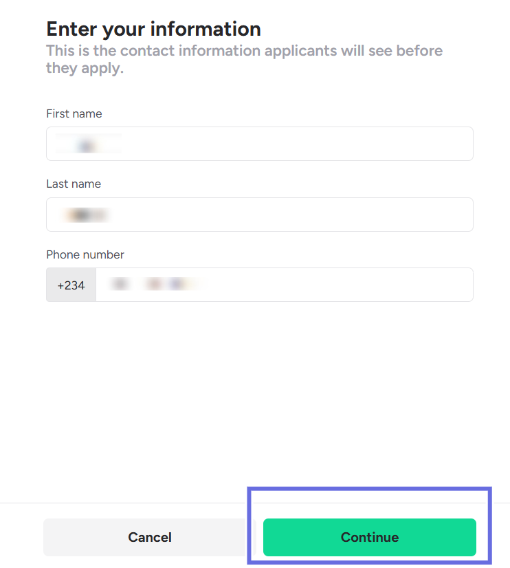 a. On the Enter your information page, enter your contact details. This information will be visible to applicants before they apply.