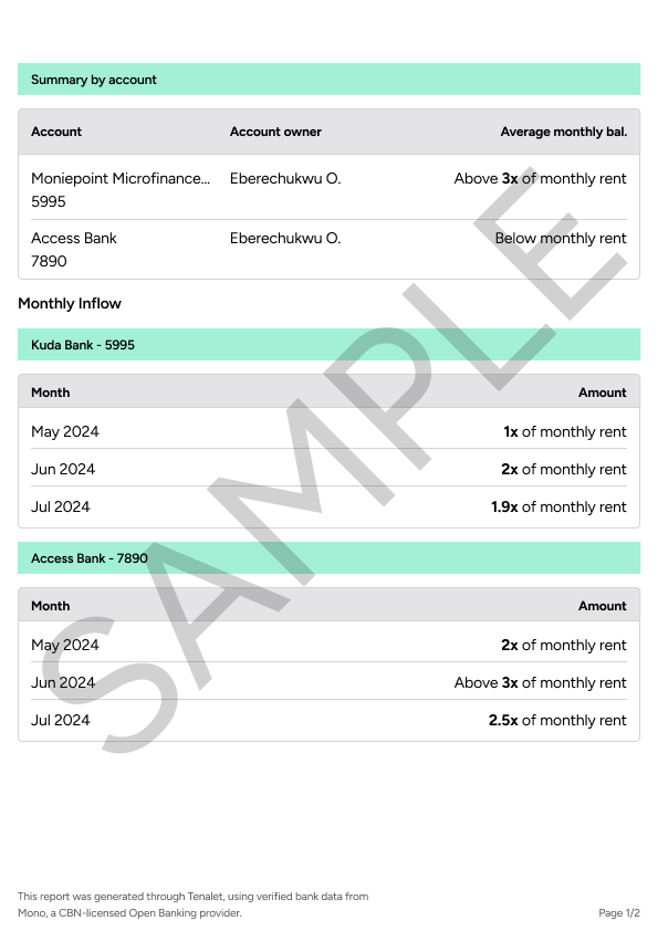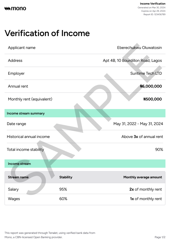 An income verification report is a document that provides information about an applicant's income if they are eligible for a rental. It uses bank-verified data to prove the applicant can afford your rent, and this uses Mono, an open banking service provider.